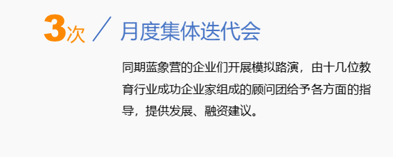 藍象資本是專注教育領域的早期基金,項目按照1000萬元估值投資30或80萬元。每年2期“藍象營”加速計劃,每期持續(xù)6個月。